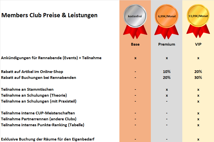 Hier die Möglichkeiten eurer Mitgliedschaft mit Leistungen und Preisen: